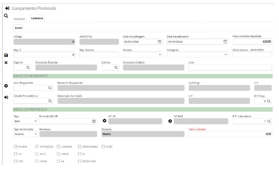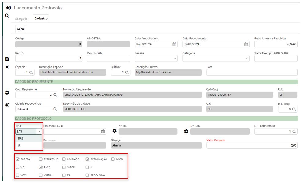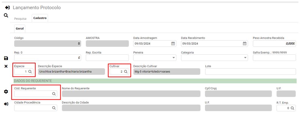 5 - Selecionar qual a Espécie e a Cultivar e os Dados do Requerente.
