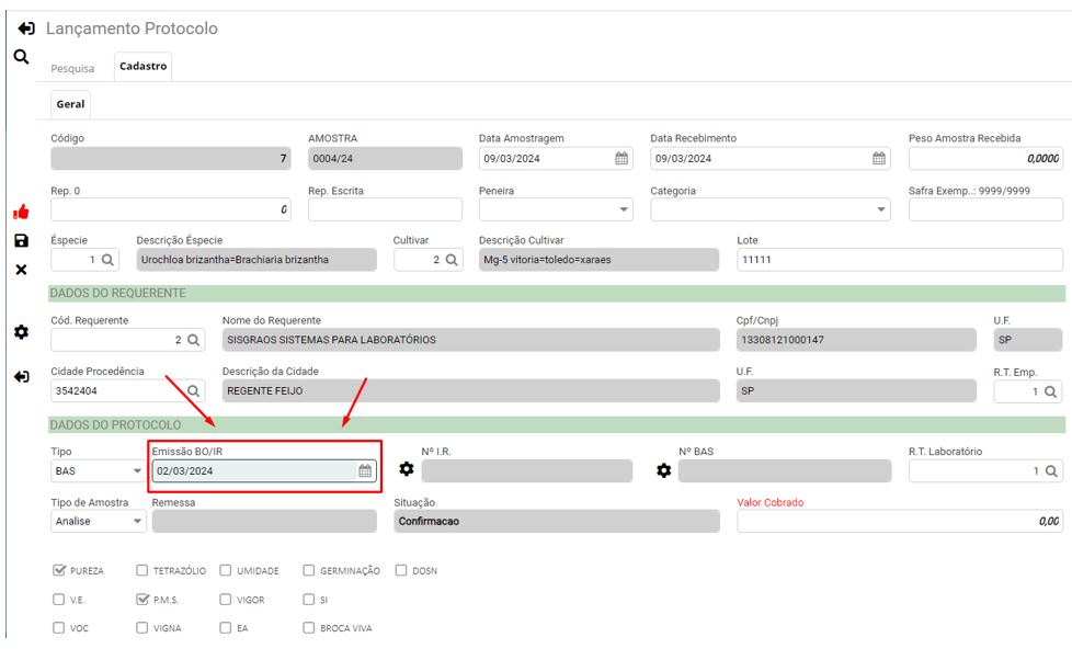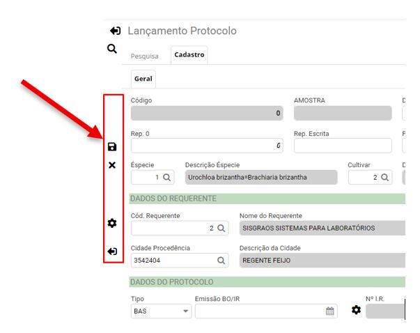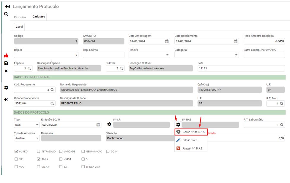14 - Para gerar a numeração subsequente do tipo de analise BAS/IR clique na Catraca/Engrenagem.
