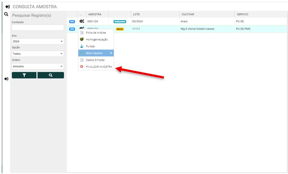 10 - Após preenchimento das informações poderá Finalizar a Amostra.