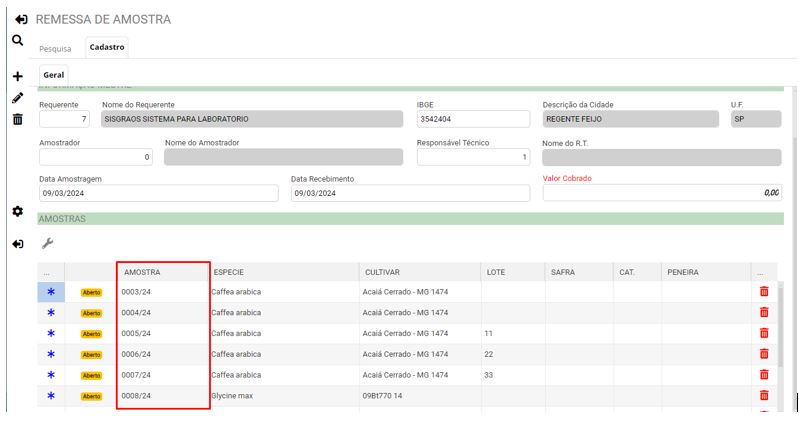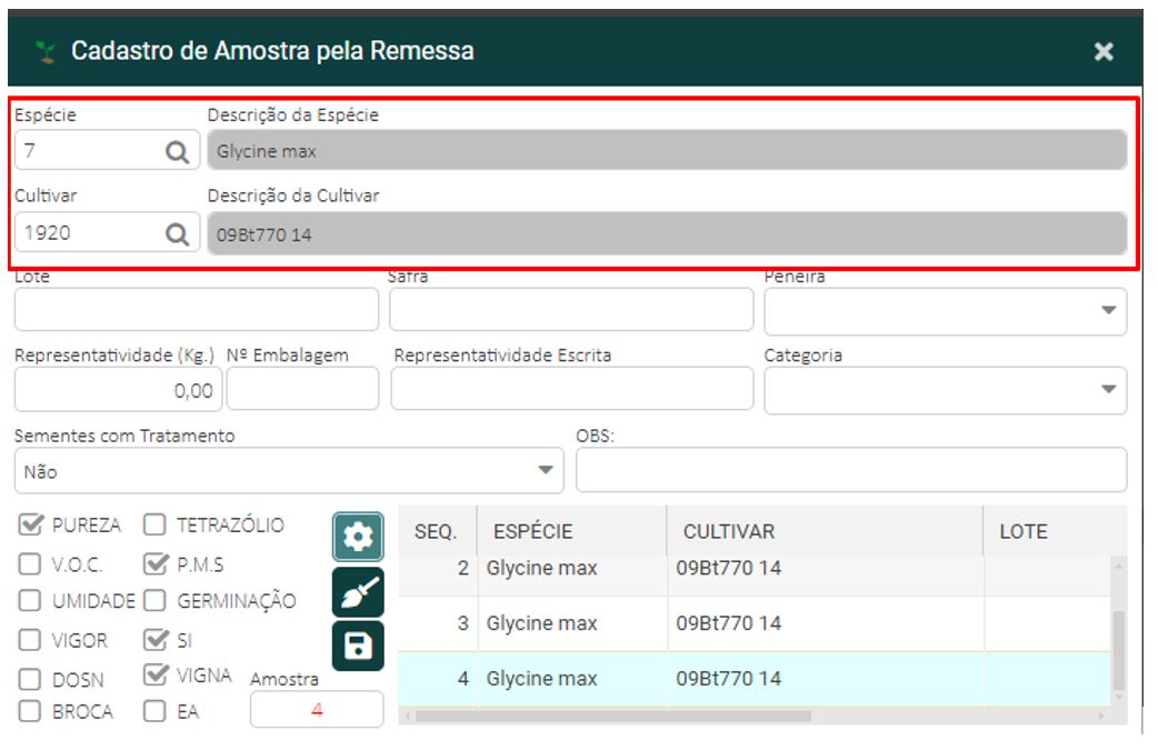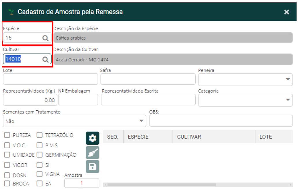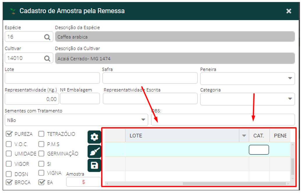7 - Poderá clicar na grade ao lado e adicionar, os lotes, cultivar, peneiras, etc...