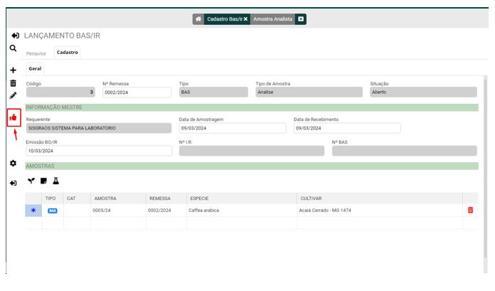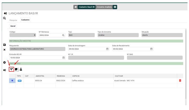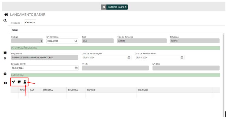 16 - Abaixo das AMOSTRAS haverá 3 ícones, clique no ícone do frasco conforme indicado e escolha qual amostra vai entrar no BAS/IR.