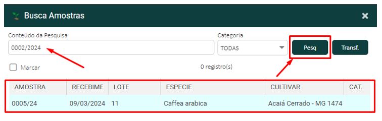 Nesse caso encontra-se uma tela que buscara de forma automática as amostras que já foram finalizadas, no exemplo, encontramos apenas uma, mas poderá estar escolhendo varias ao mesmo tempo para inserir no documento que deseja, de um duplo clique até ele mudar de cor, e clique no botão transfere.
