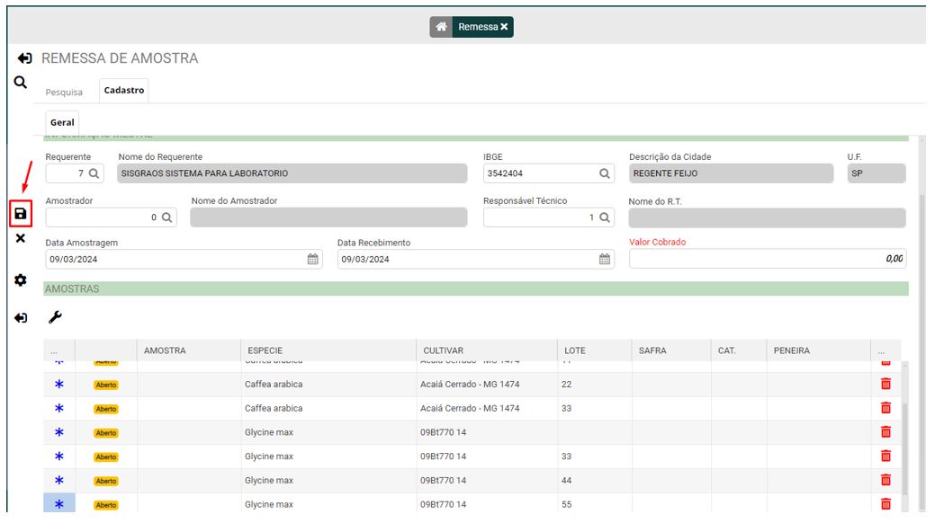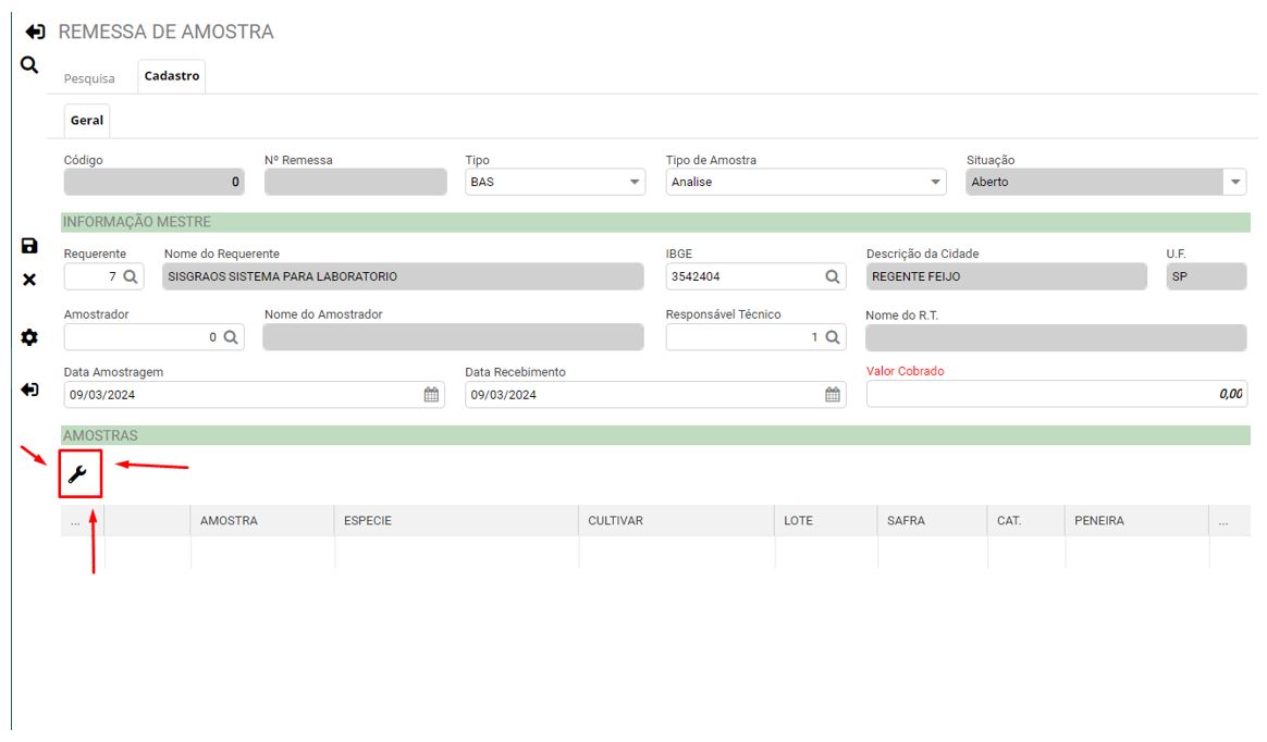 5 - Para incluir as amostras, clique no ícone de ferramenta conforme abaixo.