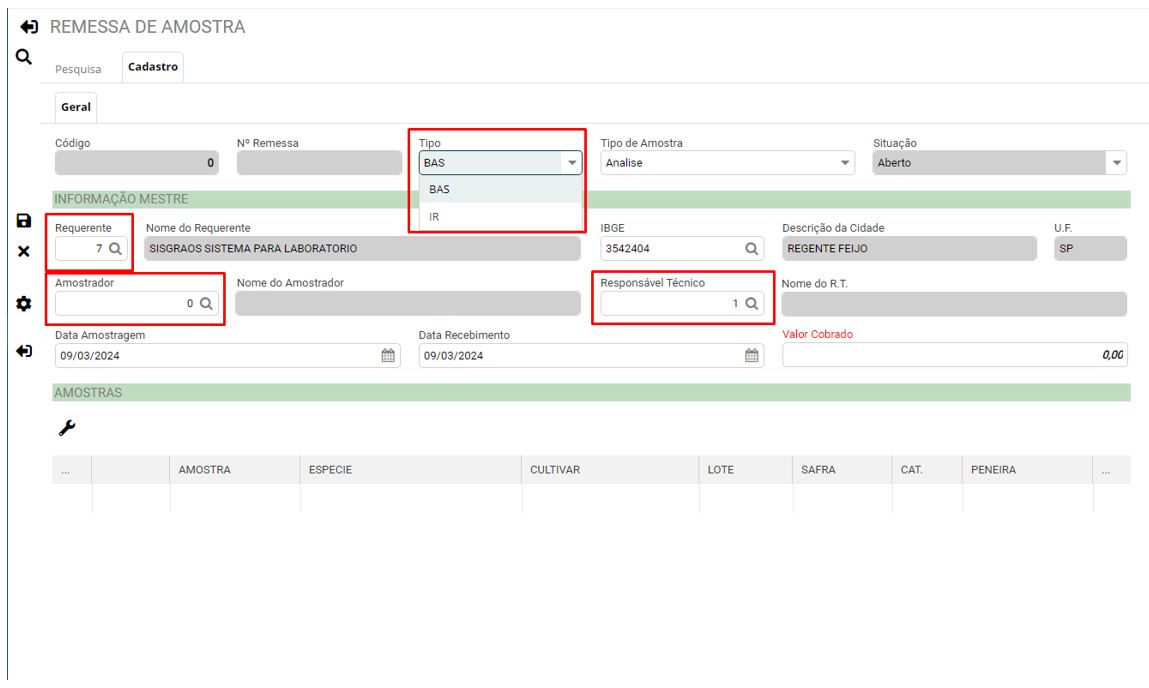 10 - Poderá colocar o código do amostrador e do RT da empresa. Feito isso poderá gravar e será gerado automaticamente o número para cada amostra lançada.