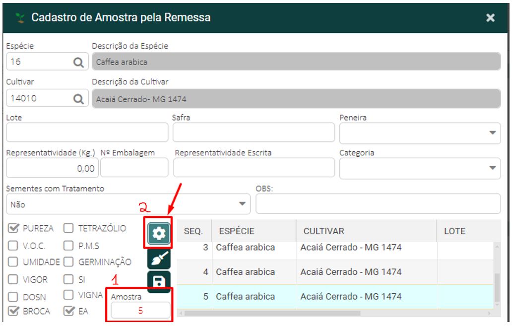 Caso tenha recebido várias amostras da mesma espécie do cliente de uma só vez, poderá estar colocando o numero de amostras recebidas (1) e clicar no ícone da catraca (2).