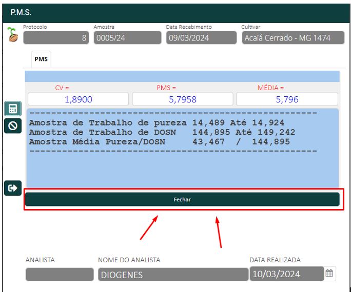 5 - Após clicar no botão de calcular, clique no botão fechar e poderá estar gravando o resultado P.M.S.