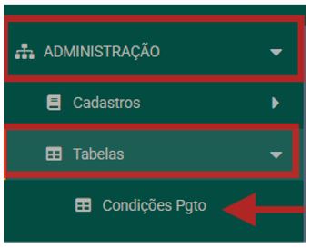1 - Para adicionar uma condição de pagamento vá em ADMINISTRAÇÃO > TABELAS > CONDIÇÕES DE PGTO.