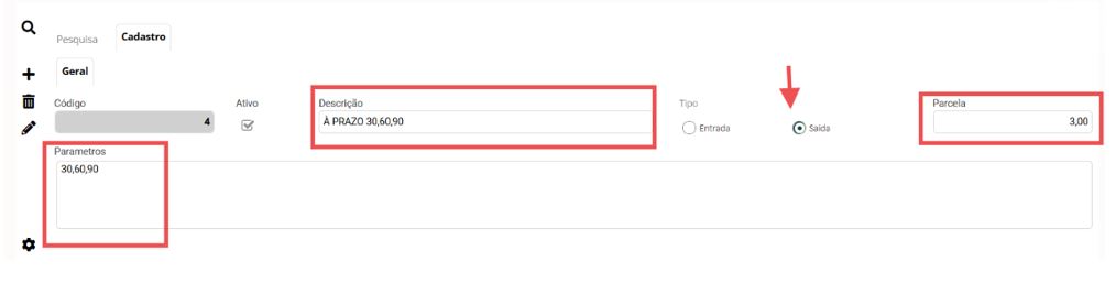 Parâmetros (colocar as parcelas de acordo com a imagem acima, exemplo 30,60,90)